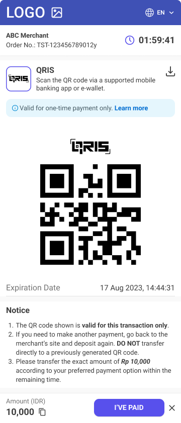 merchantCode- Your Merchant IDidPayin- Your Merchant Order IDtoken- The authorization token from the previous stepamount- Your Payment order amountcurrencyCode- Payment Order currencycallbackUrl- Your URL where we deliver a callback once Payment request status changedreturnUrl- URL to the page where we redirect your Customer after he completes the Payment